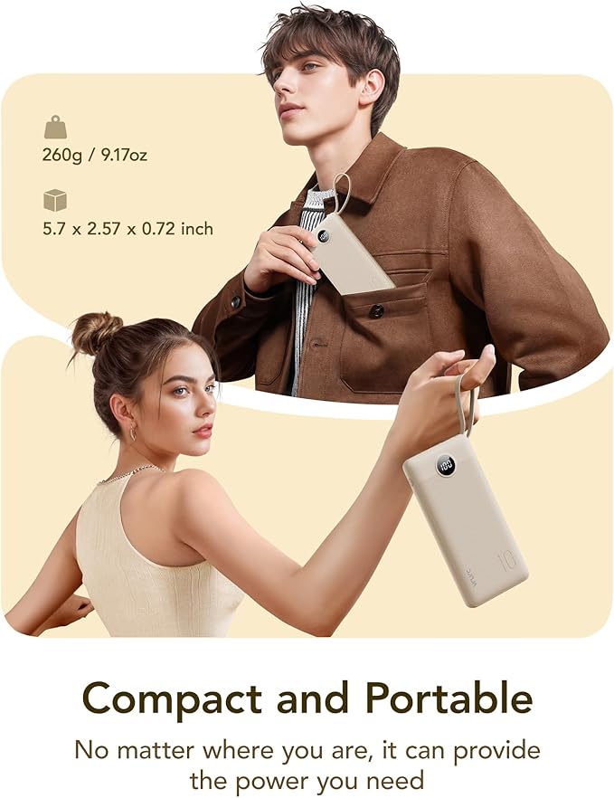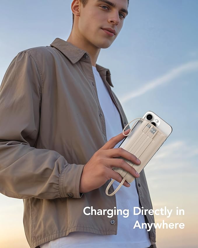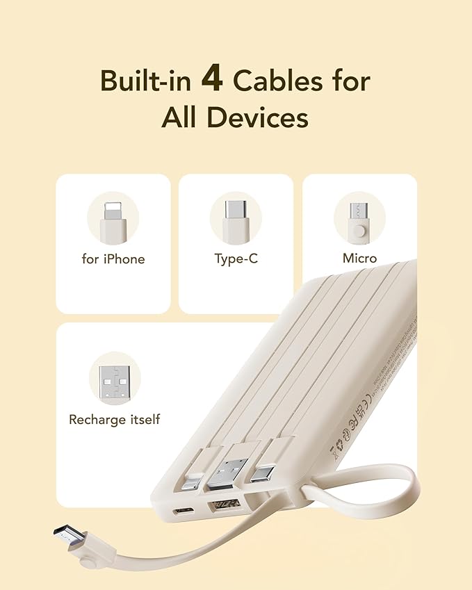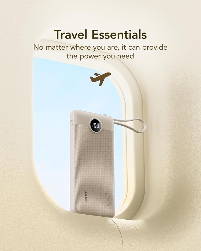VRURC Portable Charger Power Bank,10000mAh Travel Essentials Battery Pack, 5 Outputs 2 Inputs Slim USB C Charging Bank Built-in Cables Cords for iPhone 17 16 15 13,Samsung,Android-Light Coffee(1 Pack)