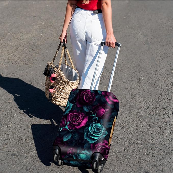 Suitcase Cover for Luggage 18-21 Inch, Washable Elastic Anti-Scratch Luggage Protector, Durable Zipper Baggage Cover with Handle Wrap, Travel Accessories for Suitcase, Purple-Green Rose