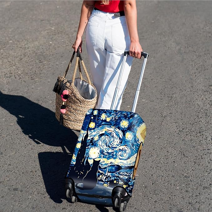 Suitcase Cover for Luggage 25-28 Inch, Washable Elastic Anti-Scratch Luggage Protector, Durable Zipper Baggage Cover with Handle Wrap, Travel Accessories for Suitcase, Starry Night Cat