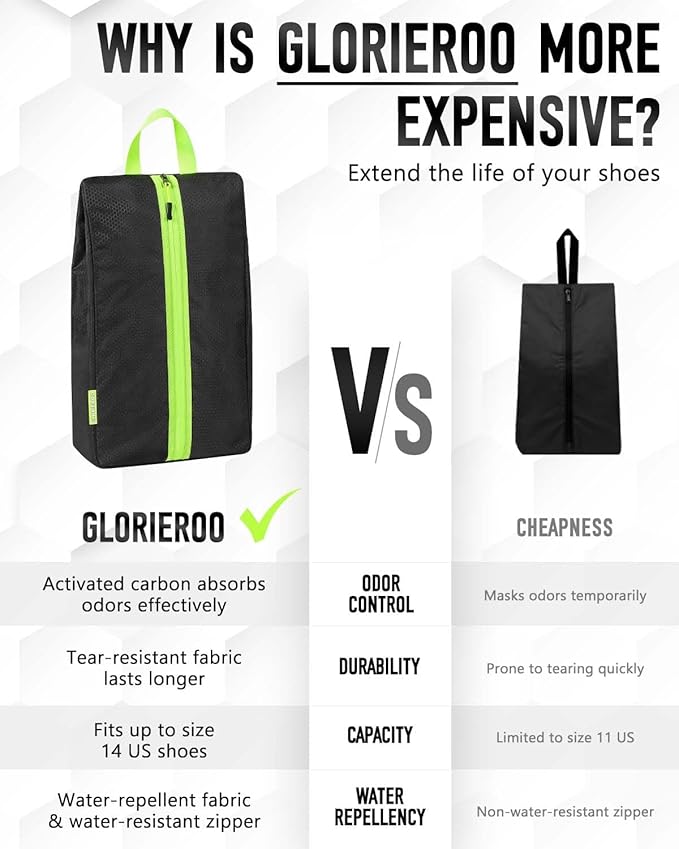 - Large Capacity & Lightweight: Weighing just 5.6 oz, the bag measures 16.1" x 9.1" x 4.7", fitting shoes up to US size 14. It easily fits into luggage, backpacks, or duffel bags, keeping your belongings or car trunk clean from dirt caused by shoes