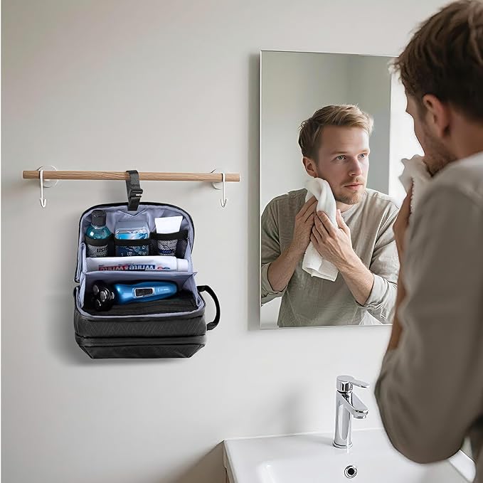 - TRAVEL FRIENDLY - Compact size 9.3 x 4.3 x 5.7 in. Can fit seamlessly in your suitcase, a holdall toiletries travel pouch for daily use, camping, beach, gym, business trip or vacation journey. It could also be used as a cosmetic bag or multi-functional organizer for men and women.