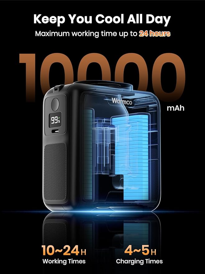 - [Long-lasting Rechargeable Battery] Equipped with 10000mAh battery capacity, Warmco waist fan runs up to 24 hours on low speed and 8 hours on high speed. Real-time LED power display shows battery status. USB-C port allows emergency phone charging when needed.