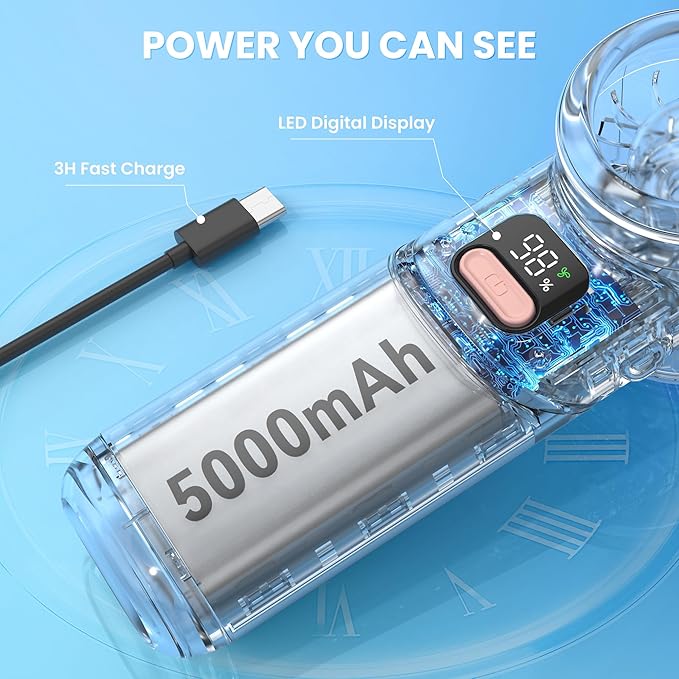 - 5000mAh Personal Fan: This battery powered fan lasts 4-19 hours—enough for a cross-country flight or weekend camping trip. USB-C fully recharges in 3hrs at your hotel/campsite - faster than most portable fans
