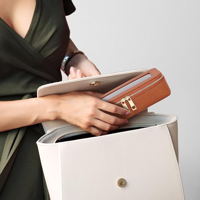 - [Versatile and Organized]- This travel makeup brush holder is perfect for storing makeup brushes and daily mini essentials like jewelry,lip balms, hair ties, Air Pods, charging cords,even pencils. Easily put into your purse, backpack, tote, or travel bag for convenient access to your essentials.