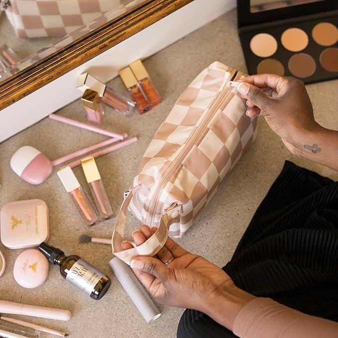 Tiny Twinkle Waterproof Travel Toiletry & Makeup Bag Organizer | Large Capacity Cosmetic Case with Compartments & Handle, A Thoughtful Travel Companion for Women(Beige Checkers