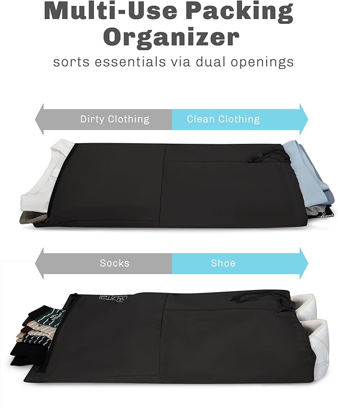 - Dual-Use Shoe & Laundry Organizer, included dual openings multi-use packing pouch separates shoes and dirty clothes without transferring odors and dirt. Features durable double pockets for quick access during weekend trips, easy to store flats, sandals, or laundry securely.