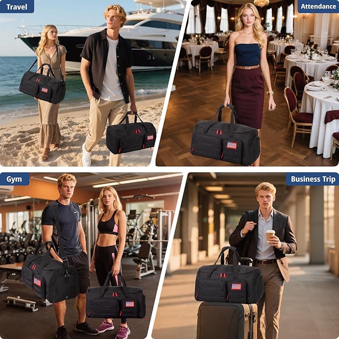 - 【Multi-Functional Pockets】 Large capacity travel bag features a large molle front pocket for extra storage and gear attachment, plus a small molle pocket with an American flag patch for added style and utility. A rear zip pocket securely holds small valuables. Inside, it offers a scarf/tie pocket, 3 garment loops, 1 securing strap, 2 zippered pockets for valuables, 1 large mesh pocket for quick access, and a ventilated shoe compartment to keep footwear dry, clean, and odor-free.