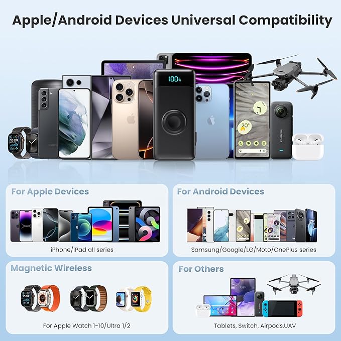 - 🔌【Travel Essentials Phone Charger Universal Compatibility】Portable charging bank with multiple usb ports, support fast charging protocol to provide tailored power for different devices. Widely compatible with all types cellphones on market, such as iPhone 17 Pro Max/17Pro/17/Air/16e/16/15/14/13/12/11/X/XS/8/7/6/SE Series (includes pro/pro max/plus/mini),Samsung,Google Pixel,LG,Moto,Nexus series phones,iPad,tablet and more devices. Wireless magnetic charging only works for Apple Watch 10/9/8/7/6/5/4/3/2/Ultra/SE.
