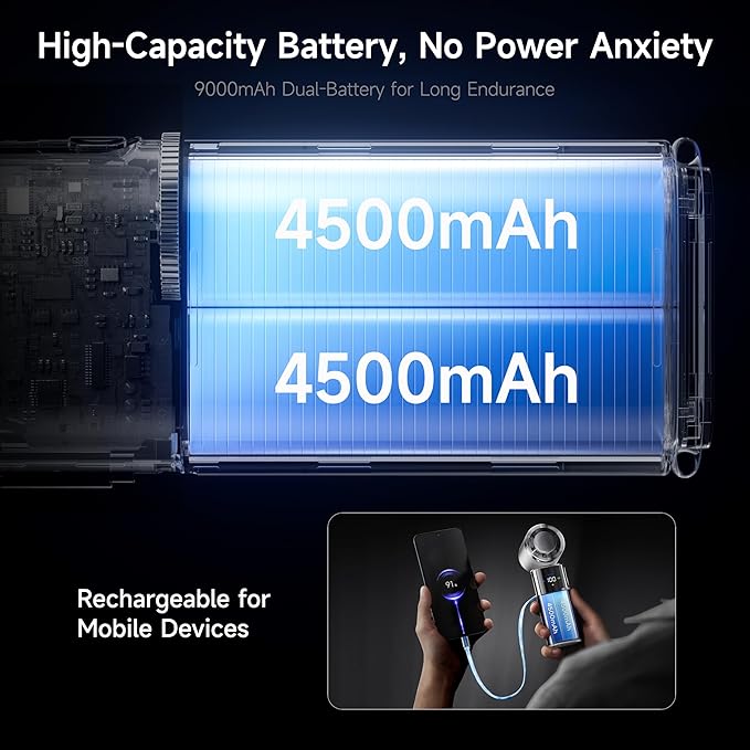 - 【9000mAh Large Battery + Power Bank Function】 The rechargeable handheld fan features a built-in 9000mAh long-life battery for all-day operation without frequent charging. 12-48hr runtime (varies by speed). A Type-C port allows reverse charging for your phone, making it ideal for outdoor activities or emergency power needs