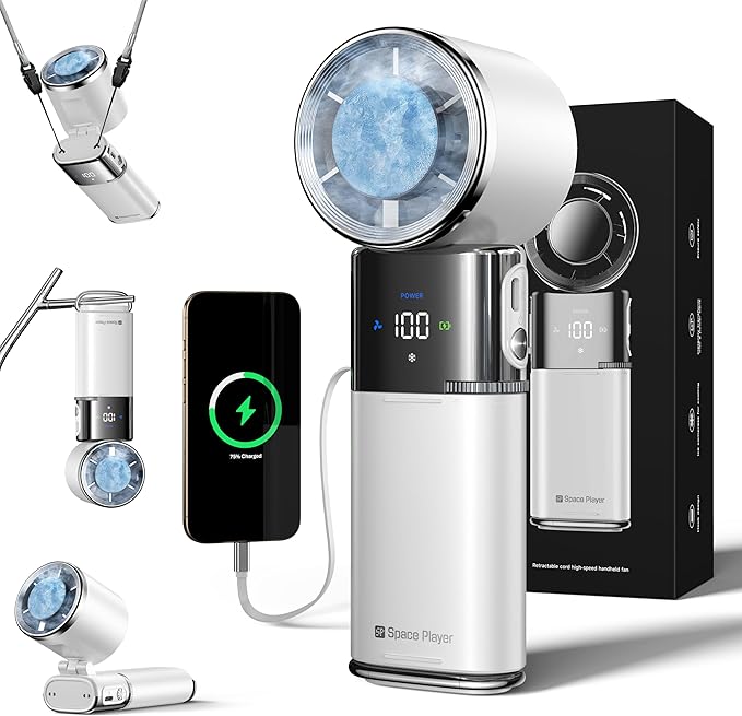 Portable Handheld Turbo Fan with Ice Cooling, 9000mAh Rechargeable Personal Fan, 100-Speed Wind, Built-in Type-C Cable, LED Display,135° Tilt Foldable for Desk/Neck/Travel-White