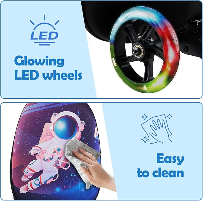 - LED Light Wheels:Equipped with eye-catching wheels that illuminate with every movement, adding a cool and stylish touch. The three easy-glide skate wheels provide a stable ride, helping children develop balance and motor skills. Additionally, the luggage scooter features easy tilt steering and a locking mechanism, ensuring a safe and effortless ride for your child.
