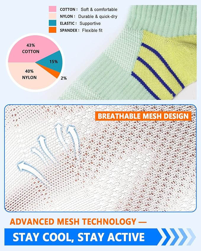 - Breathable Mesh & Durable Comfort Blend-Stay fresh and dry all day with high-performance mesh panels that wick away moisture and enhance airflow. Crafted with a 43% cotton + 40% nylon + 15% elastic + 2% spandex blend, combining softness, durability, and flexibility — no odor, no stickiness, just cool comfort.