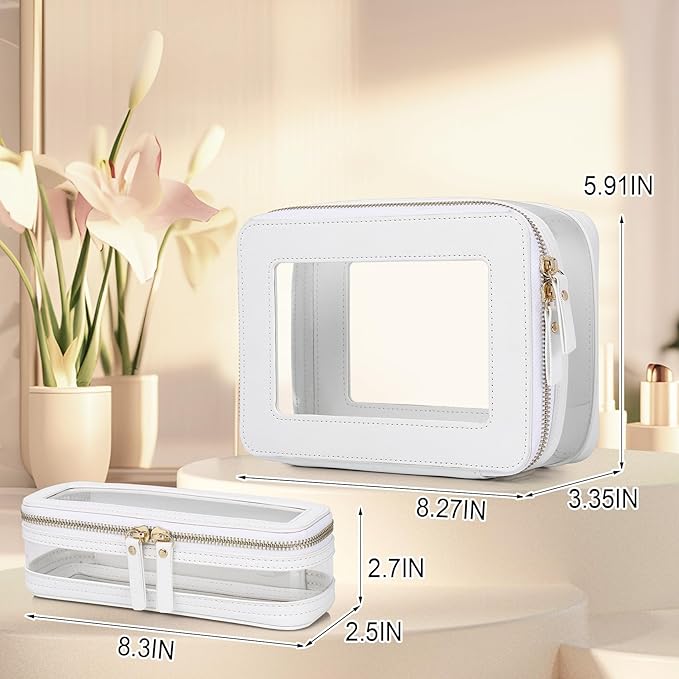 - [Clear makeup bag]: This clear cosmetic bag features a medium size (8.27" * 5.9" * 3.35"), providing ample space for all your cosmetics and toiletry items. It is ideal for travel, fitting perfectly in your carry-on or suitcase.