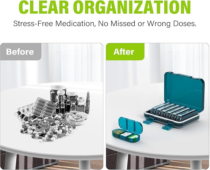 - Compact & Travel-Ready: Weighing 277g (9.8oz), with outer dimensions of 17.5×12.5×5cm (6.9×4.9×2.0in) and inner box dimensions of 10.8×4.3×2.2cm (4.3×1.7×0.9in), this 7 day pill organizer is portable and perfect for managing your weekly medication at home or on the go.