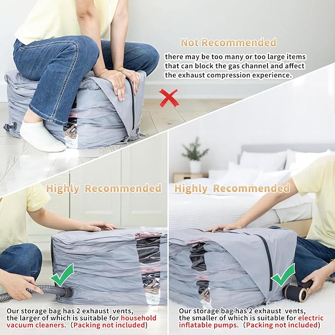 - 🏠Usage: Instead of using your body to release air, we highly recommend using household and car vacuum cleaners, as well as electric air pumps (not included). Because when manually pressing the exhaust, there may be too many or too large items that can block the gas channel and affect the exhaust compression experience. Therefore, we have set up a large exhaust nozzle on the side of the storage bag to facilitate the use of vacuum cleaners and air pumps for air extraction