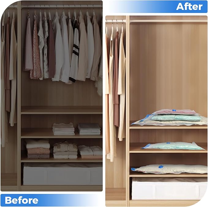 - Premium Materials: These reinforced vacuum storage bags maintain thickness and robustness, are made of premium PA+PE composite material, feature double zipper seals, are sturdy, long-lasting, and soft, and can be used repeatedly during packing, closet organizers and storage, and travel. This vacuum seal bags for blankets ensures that your items are always protected from dust, moisture, and odor; they are ideal for bedding, quilts