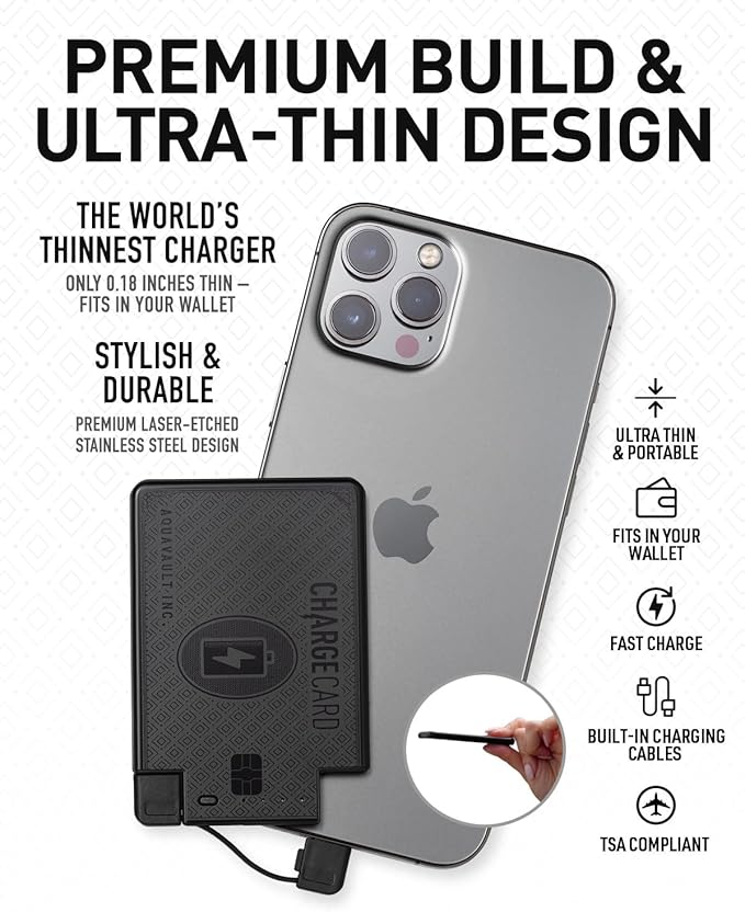 AquaVault ChargeCard – Ultra Slim Emergency Power Bank (2300mAh) – Fits in Wallet – USB-C & Micro-USB – Durable Steel Body – Flight-Safe for iPhone 12-17 & Android - Matte Black