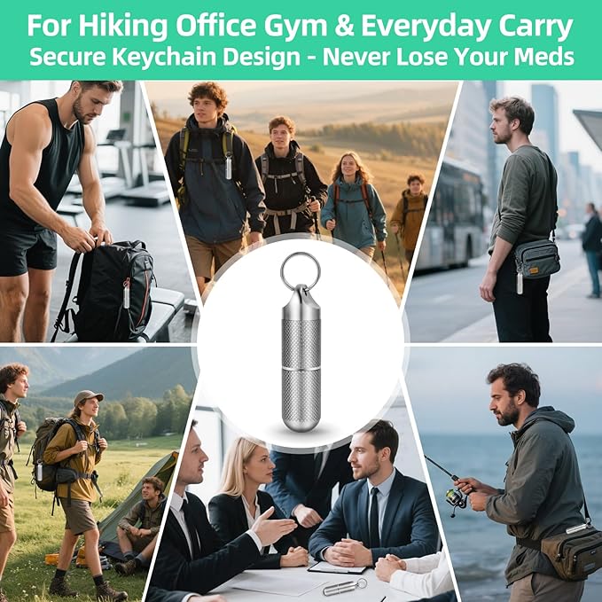 - Essential for Healthy Living Daily Commute: Store nitroglycerin (angina relief), allergy meds, or private medications—lifesaving convenience. Outdoor Adventures: Carry effervescent tablets, vitamins—titanium shell withstands drops and shocks during hiking/camping. Business Travel: Organize melatonin, vitamin B—your time-zone adjustment tool