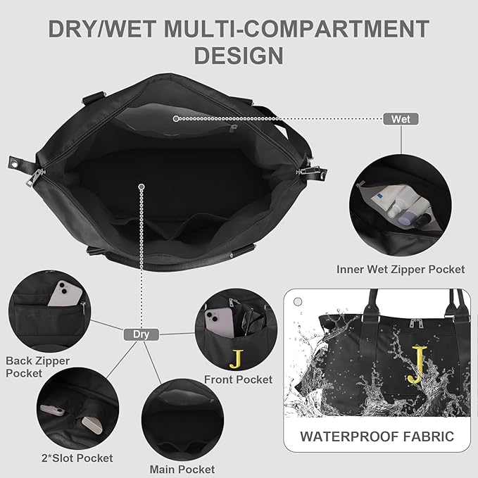 - 【Dry/Wet Multi-Compartment Design】Carry On Tote Bag with waterproof organization, A high-density waterproof PVC zippered compartment separates wet clothes or towels from dry items. Exterior features include a front open-access pocket for quick grabs (phone, tissues) and a rear zippered security pocket for passports or valuables