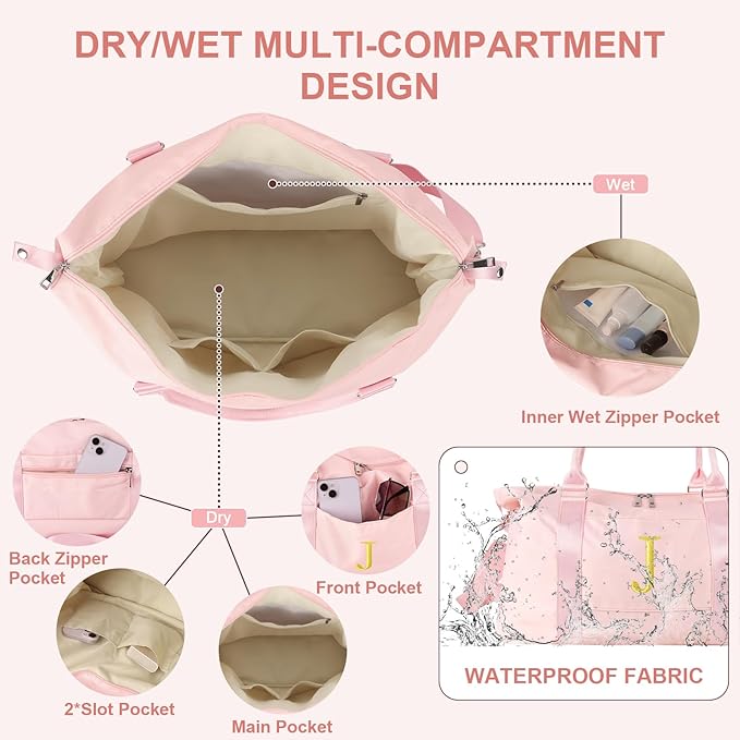 Personalized Initial Gym Dance Bag, Travel Duffel Bag for Teen Girls, Carry On Bag Overnight Weekender Bag with Trolley Sleeve, Birthday Gifts for Women Mom Daughter Graduation Gift(Letter J, Pink)