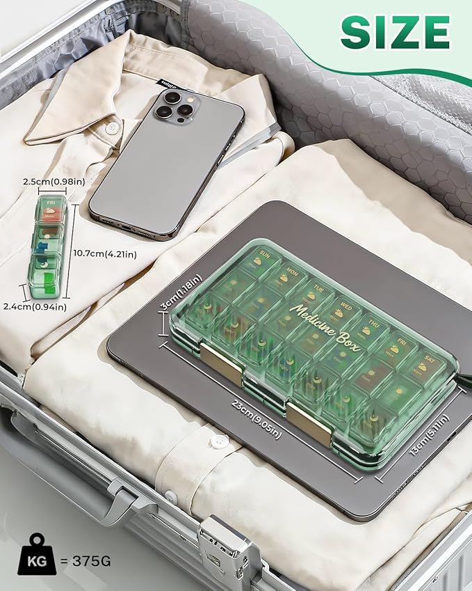 - The Right Travel Pill Organizer: Each slot of this large daily pill organizer holds a considerable amount of pills, this 7 days 3 times a day pill organizer is a good size and can be easily sent in a coat pocket or satchel, for daily outings or short trips, you can dismantle the pills for the exact number of days you need without having to carry the entire 7 days pill dispenser, greatly reducing the burden on your luggage, take it with you anytime you travel.