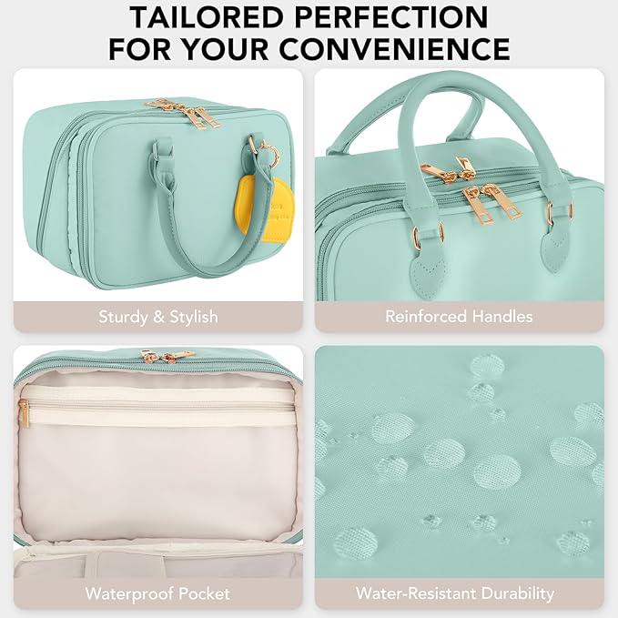 - Large Capacity: Measuring 9.8x6.3x5.5 inches, the cosmetic bag has 2 separate compartments to comfortably hold all your favourite cosmetics, make-up tools, toiletries, travel essentials, etc. Each compartment comes with multiple pockets to keep your cosmetics organised. The EVA pocket is designed specifically for holding makeup brushes, sponges and puffs.