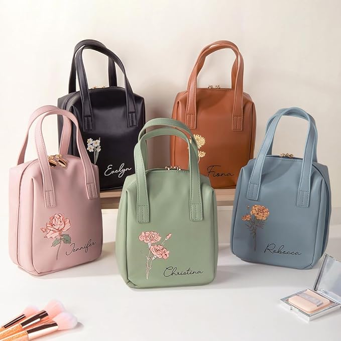 callie Personalized Makeup Bag - Custom Birth Flower & Name, Leather Cosmetics Organizer Travel Bag with Double Zippers & Handle, Birthday Mother's Day Gift for Women