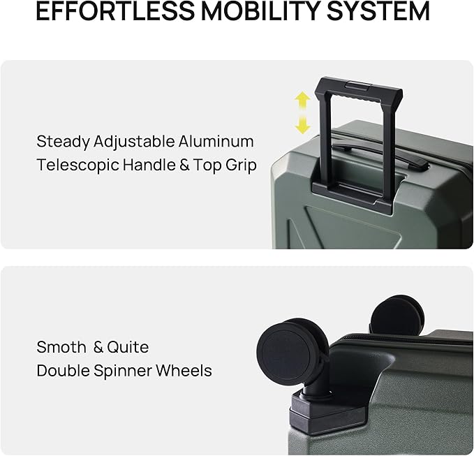 - 【Effortless Mobility System】Features 4 durable double spinner wheels for 360° effortless maneuverability, paired with a sturdy aluminum telescopic handle offering 4 adjustable height positions for comfortable pulling.