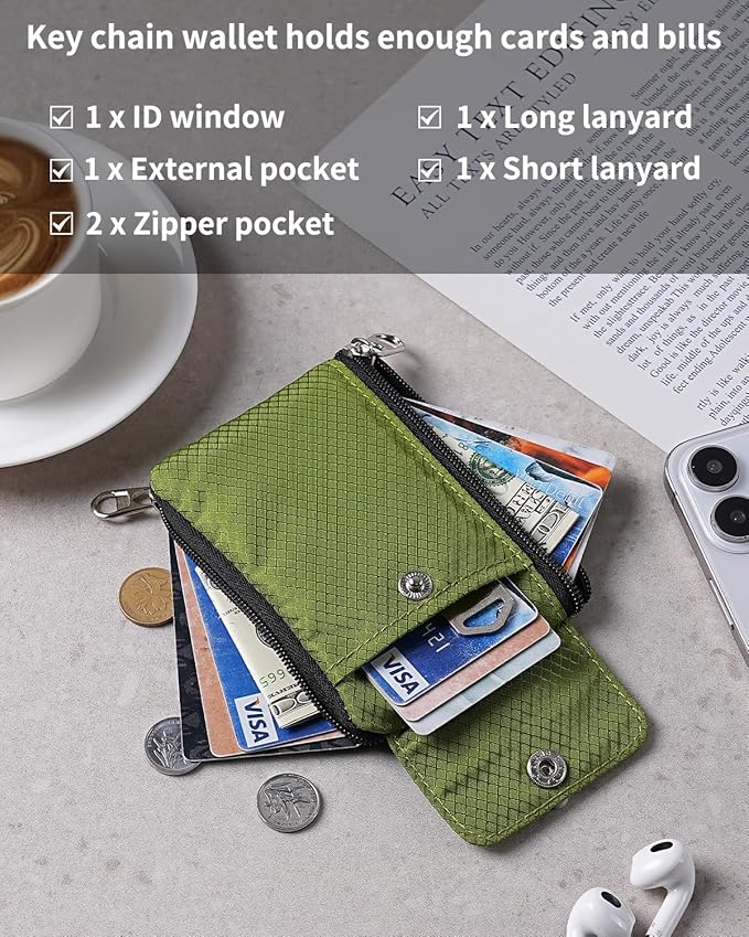 Minimalist Wallet For Mens Womens, Keychain RFID Blocking Zipper Small Wallet with ID Window 2 Lanyards,Water Resistant Travel Cash Card Coin Case Boys Girls