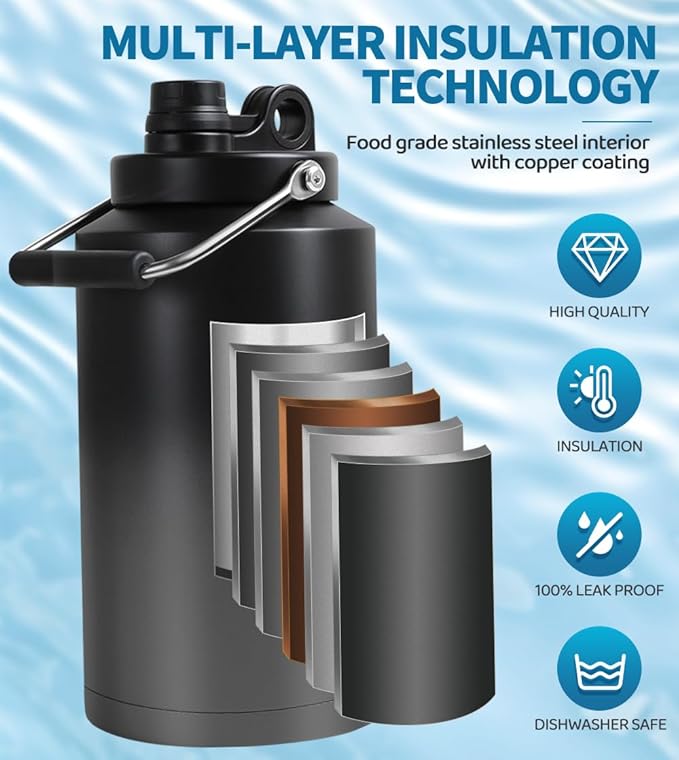 - Giant 1-Gallon Hydration (128 oz): Never run out of water! This huge insulated stainless steel water bottle holds a full gallon (128 oz) - enough to keep you refreshed all day without refill.