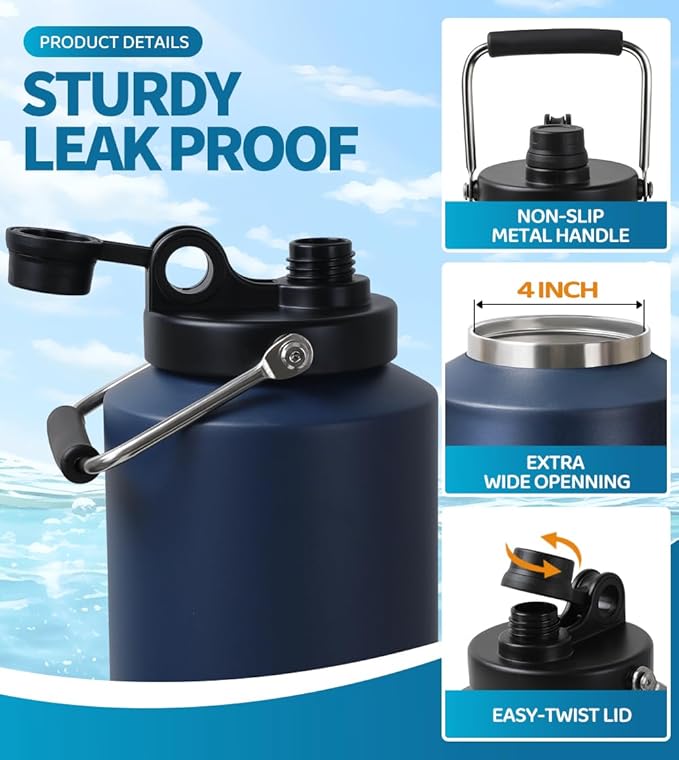 Insulated Water Bottle, 1 Gallon Jug with Handle, 128 oz Stainless Steel Large Water Bottle Wide Mouth Double Vacuum for Hot & Cold Drinks, Navy Blue