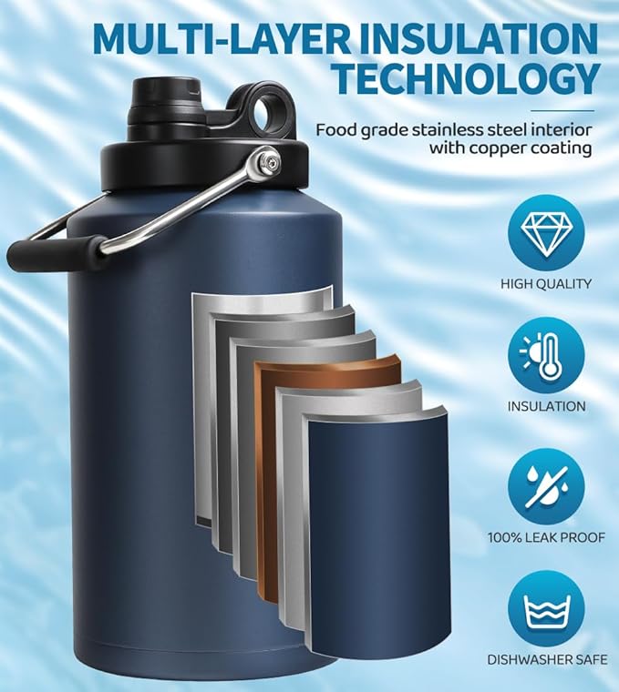 - Giant 1-Gallon Hydration (128 oz): Never run out of water! This huge insulated stainless steel water bottle holds a full gallon (128 oz) - enough to keep you refreshed all day without refill.