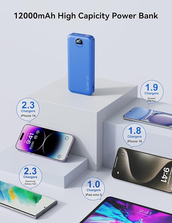 - 【12000mAh High Capicity】12000mAh portable battery can charge for iPhone 15 about 1.8 times, for Samsung Galaxy S22 about 1.8 times, for Huawei P50 Pro 1.9 times, for tablet mini 4 about 1.4 time,power for the whole day. Don't let a low battery interfere with your travel pleasure.