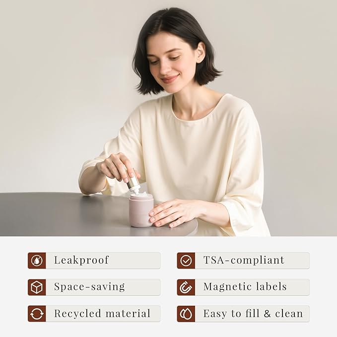 - 【Magnetic Labels — Snap On, Swap Fast, Stay Organized】 No more confusion or wasted time guessing what’s inside. Our 5 magnetic labels—Cleanser, Lotion, Shampoo, Conditioner, plus a Pill Icon—snap on instantly and swap easily to fit your changing routine. Perfect for busy mornings, travel packing, or gym essentials.