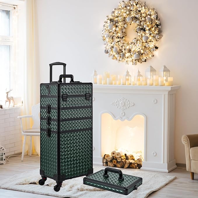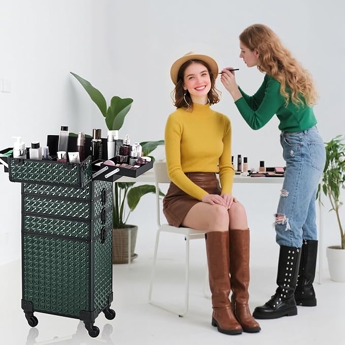 Rolling Makeup Case, Makeup Train Case with Lid, 5 in 1 Cosmetology Case on Wheels, Christmas Gift, Large Makeup Case Organizers, Profesional Cosmetic Case for Salon Barber,Black Green