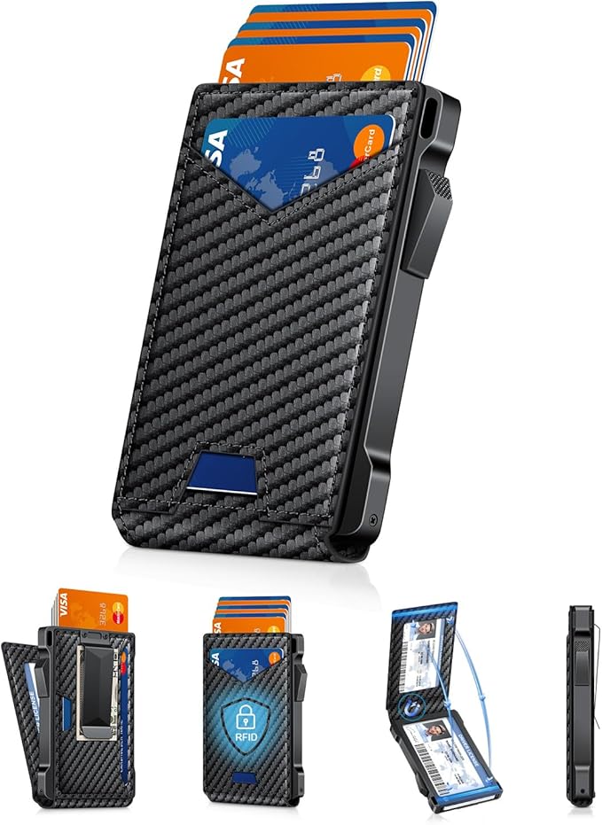 - QUICK CARDS ACCESS: This minimalist wallet for men features a smooth pop-up mechanism. Just press the side button, and the cards slide out in a stepped layout for easy access.