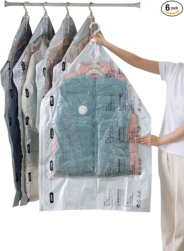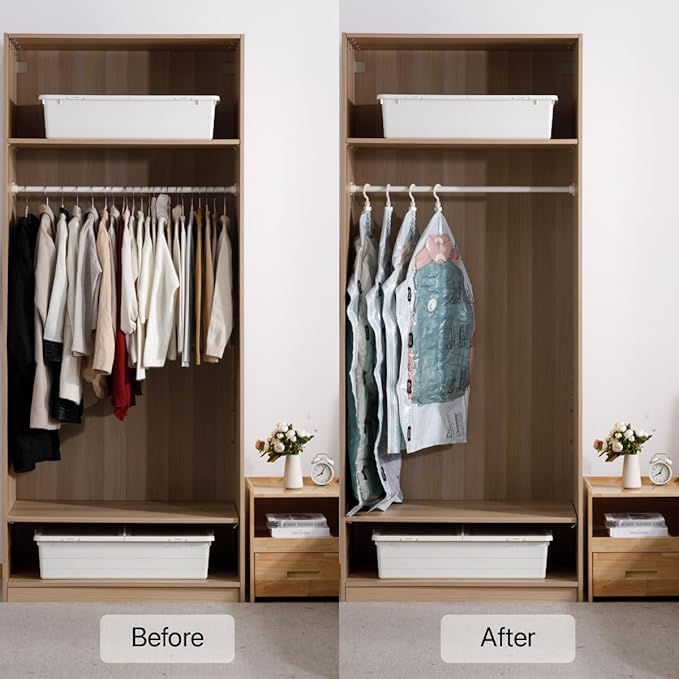 - HANG & SAVE CLOSET SPACE EFFICIENTLY Each bag has a built-in sturdy hanger that holds 3–5 garments. Compress bulky clothes vertically to free up to 80% of your closet space while keeping items organized.