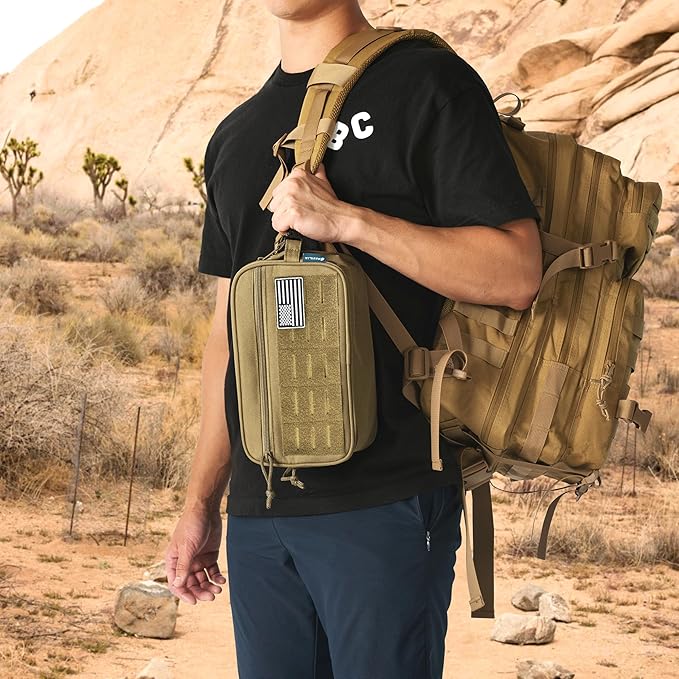 - MOLLE MILITARY TOILETRY BAG: Equipped with Molle system webbing on the front and multi-use Molle straps on the full back, this tactical hanging toiletry bag can easily attach essentials, keys, carabiners, accessories, backpack or vest. A clip on buckle handle also allows to attach any bathroom bars and hangers for easy access to the pouch. The hook and loop Velcro on the front also provides personalization with flags, patches and badges, making this adults toiletry bag truly your own.