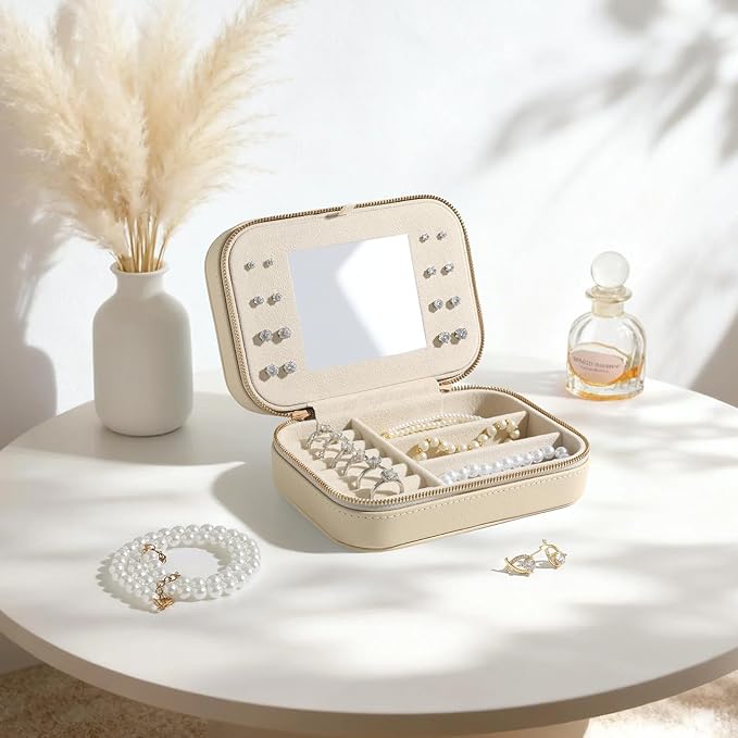 Genuine Leather Travel Jewelry Organizer Case with Mirror for Women, Small Mini Portable Jewelry Box for Ring Earrings Necklace Bracelet Luxury Gift for Women(Beige)
