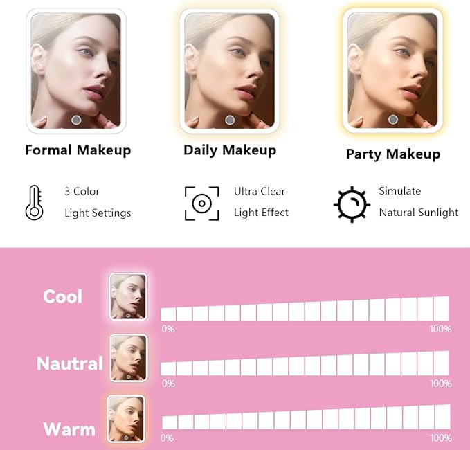 - Removable & Adjustable Brightness High Definition LED mirror:the travel makeup bag with vanity mirror of led light 3 color setting and 10x Magnifying Mirror. and 0-100% adjustable brightness that can be switched. With a long press on the switch, and a short press can adjust the color temperature between cool, natural and warm light.can be disassembled for separate use, and the makeup mirror comes with a separate stand that can be conveniently placed on the table according to your needs.
