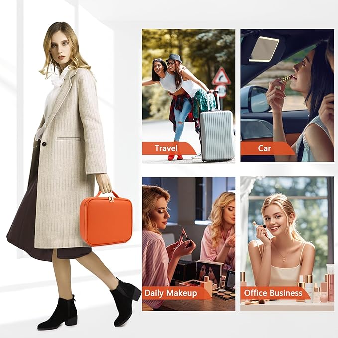 Travel Makeup Bag for Makeup Artists Large Makeup Case,with Mirror 3 Color Setting and Detachable 10x Magnifying Mirror Travel Makeup Bag,Portable Storage and Adjustable Dividers (orange)