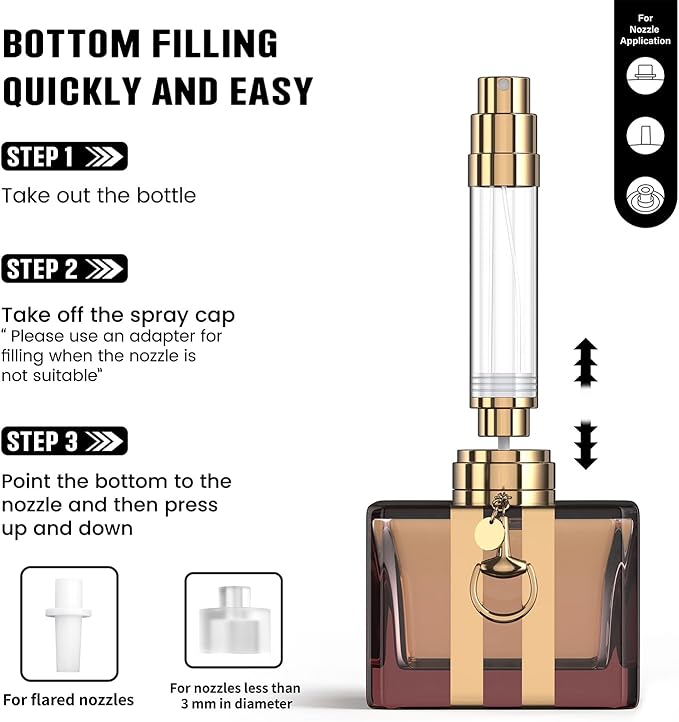 - Quick & Easy to fill: Simply press the bottom valve and use included adapters to fill cologne travel bottle in seconds - no funnels or mess, so you can quickly transfer your favorite fragrances on the go
