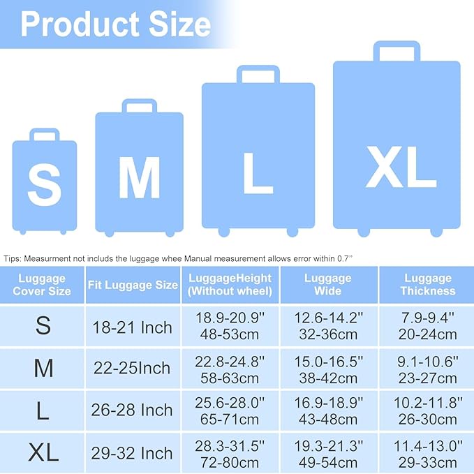 - Four Sizes Available: There are four sizes available to accommodate practically any suitcase. Please measure your suitcase before making a purchase. Only the bag cover is supplied; the suitcase is not included.