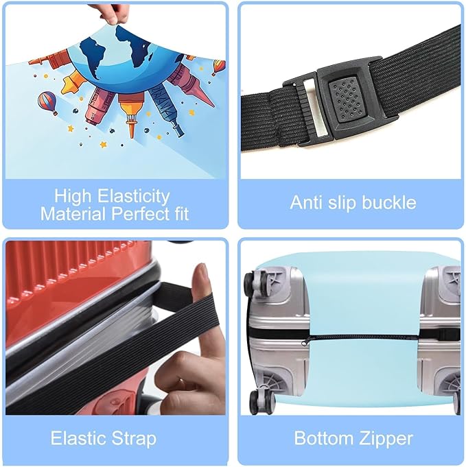 Luggage Cover - World Travel Themed Suitcase Protector with Iconic Landmarks and Hot Air Balloons Tsa Approved- Durable, Elastic, and Stylish Design for Travel Bags,L