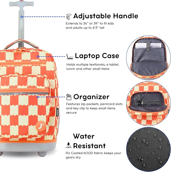 J World Sundance Laptop Rolling Backpack for Girls Boys. Roller Bookbag with Wheels, Wiggle Coral