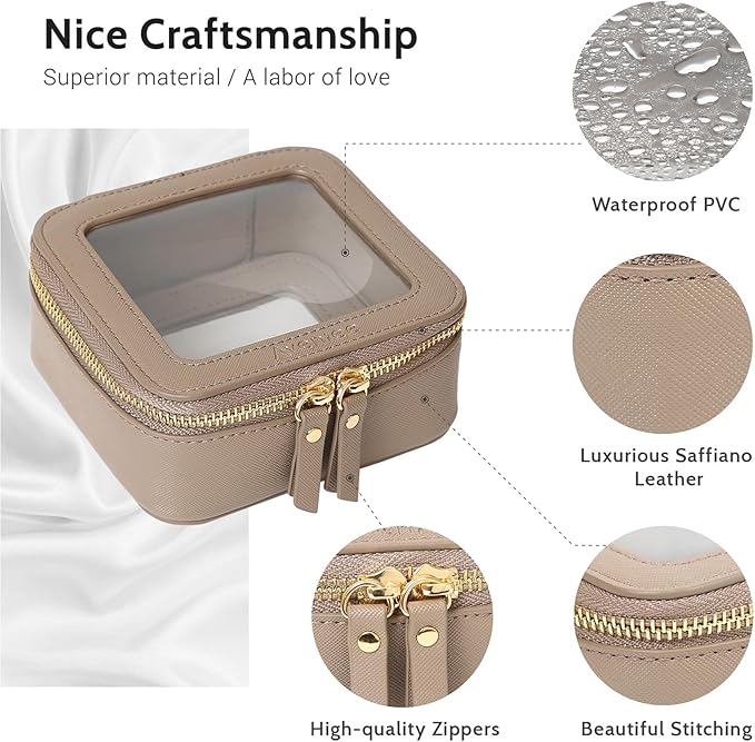 - ❤【LUXURY DESIGN】Unlike other flimsy clear makeup bags, our mini cosmetic case(measuring 5.1’ x 4.8’ x 2.35’) which made of premium saffiano PU leather and thick vinyl can keep a good structure and. The small cosmetic bag was designed into a minimalist boxy shape, crafted in beautiful PU leather and finished with polished hardware. Together with the beautiful stitches and whisper-quiet metal zippers, it’s durable for long-lasting use.