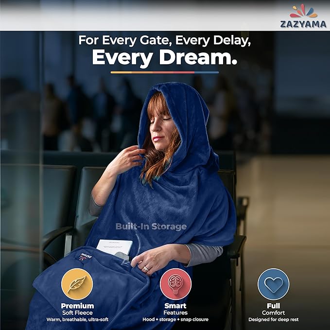 - Experience in-flight calm with ultra-soft fleece and a light-blocking hood designed to fit over headphones. This travel blanket wraps you in warmth and serenity, making long flights or layovers more restful and stress-free.