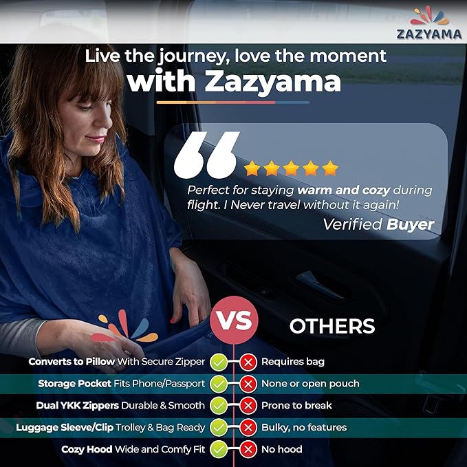 - More than a blanket—this 3-in-1 essential transforms into a pillow or wearable pouch. Use it as a cushion, wrap it for warmth, or wear it hands-free. It adapts to planes, trains, cars, and terminals for ultimate travel flexibility.
