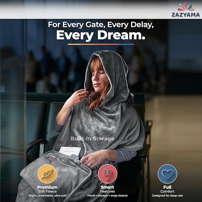 - Experience in-flight calm with ultra-soft fleece and a light-blocking hood designed to fit over headphones. This travel blanket wraps you in warmth and serenity, making long flights or layovers more restful and stress-free.