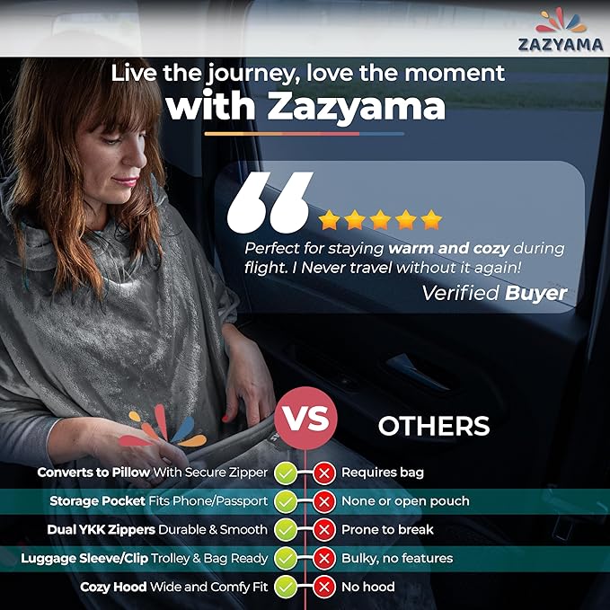 - More than a blanket—this 3-in-1 essential transforms into a pillow or wearable pouch. Use it as a cushion, wrap it for warmth, or wear it hands-free. It adapts to planes, trains, cars, and terminals for ultimate travel flexibility.